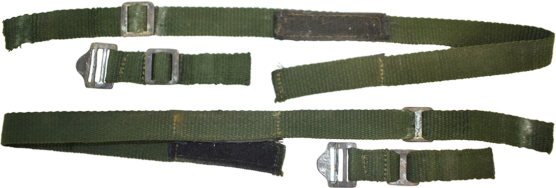 Ces bandes sont maintenues à l'arrière par trois boucles à double fente solidarisées chacune à une petite patte de toile, elle-même cousue à l'arrière du cerclage de toile. La fente supérieure de chaque boucle est dentelée afin de mieux assurer le positionnement de la sangle.