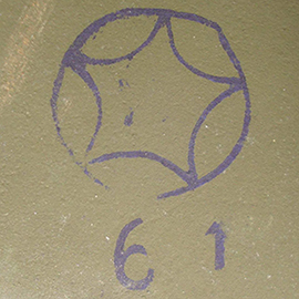 L'arrière de chaque casque produit par "Octobre rouge" reçoit un marquage estampé directement dans l'acier au niveau de la nuquière. Ce marquage indique la taille du casque (1 à 3) suivi d'un numéro de lot d'acier. La taille et le numéro de lot d'acier peuvent être séparés d'un tiret plus ou moins large. On observe aussi ce tiret estampé verticalement. |