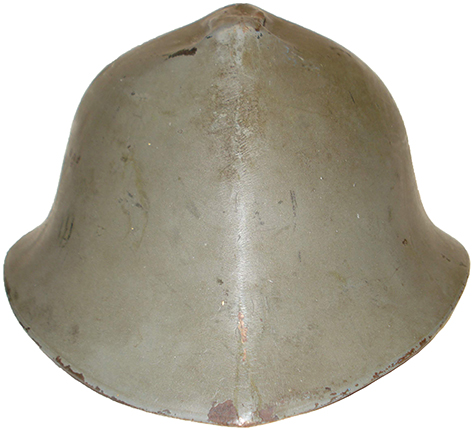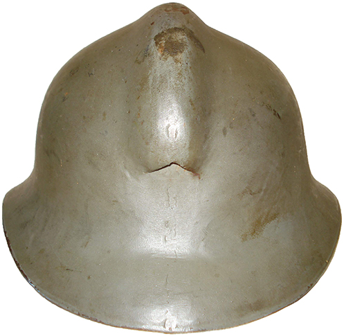 Casque modèle 18 reconditionné en 1943. Mal repeint, on distingue parfaitement la sciure de bois qui a servi à rendre son aspect extérieur granuleux. |